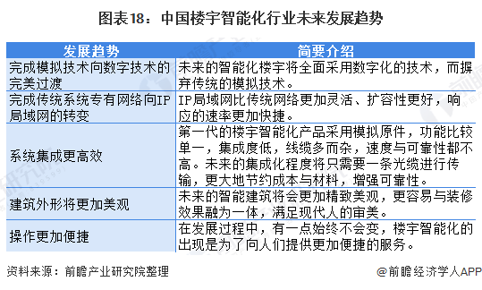 根据第三十五届中国(天津)2021 IT、网络、信息技术、电子、仪器仪表创新学术会议上发布的文章《浅谈楼宇智能化系统在数据中心节能技术中的应用》,楼宇智能化行业未来有五大发展趋势,分别是完成模拟技术向数字技术的完美过渡、完成传统系统专有网络向IP局域网的转变、系统集成更加高效、建筑外形更加美观和操作更加便捷。综合来看,行业的发展整体方向为给人们带来更加便捷舒适的生活质量,达到节约能耗、节约人工的效果。