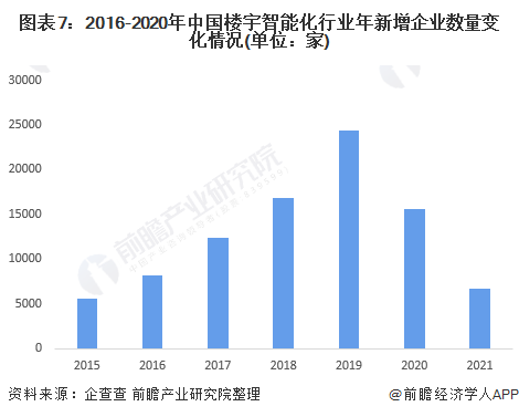 目前,我国楼宇智能化行业正处于高速发展期。在“企查查”网站中搜索“楼宇智能化”相关企业,2015-2021年,我国楼宇智能化相关企业新增数量呈先上升后下降的趋势,从2015年约5500家,增长至2019年的24404家,增长幅度近3.5倍;2021年,新增企业数量下降至约6600家。从一定程度上,行业内企业规模较大,企业数量扩张较快,行业参与者对于该行业的发展较有信心。
