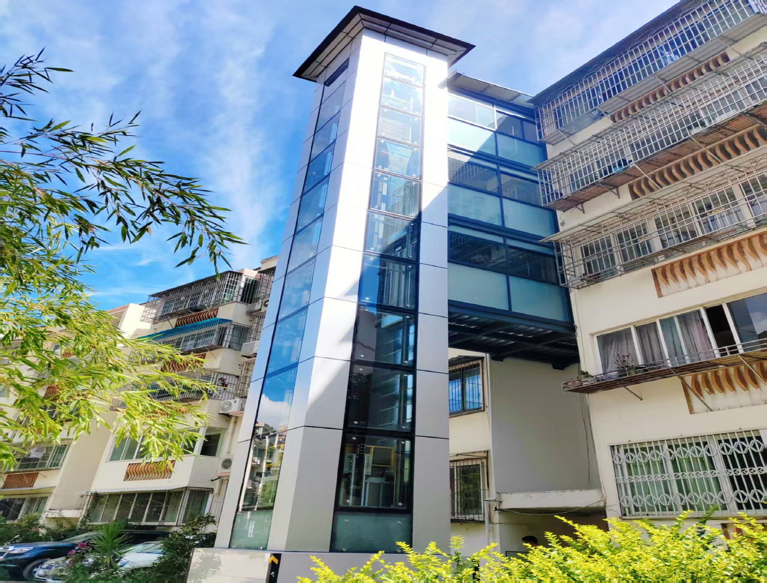 图示:四川新图新电梯完成的典型旧楼加装电梯项目,注重与建筑环境的协调。