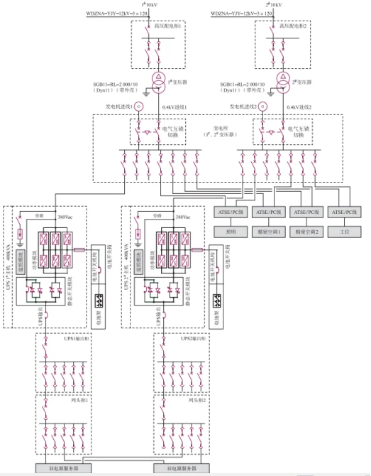 10kV高压电源分别由2路不同变电站市电引来,高压和低压不联络,第三电源由动力中心柴油发电机引来,主备用电源和发电机电源在变压器出线处切换,保证数据中心用电设备可靠用电。考虑单台发电机容量远远小于2500kW,且发电机台数也未达到10台以上,故选用0.4kV低压发电机组。0.4kV发电机组中性点应采用直接接地方式,且发电机星形点之间连接的导体应保证绝缘。数据中心共设2套400kVAUPS系统,组成2N容错型系统。双回路、双输出柜可为数据中心电子信息设备、工位插座供电。UPS系统的蓄电池可为全部①级负荷提供15min的持续供电。数据中心的服务器单机负荷按照3kW考虑,大负荷不超过4kW。为避免数据中心UPS在电源切换过程中故障影响重要负荷的正常工作,市电与柴油发电机的切换开关ATS应采用PC级且中性线重叠切换的四级开关。
